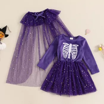 Girls Skeleton Print Halloween Dress with Shawl – Long Sleeve Tulle Patchwork Outfit
